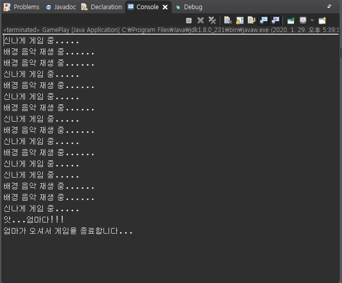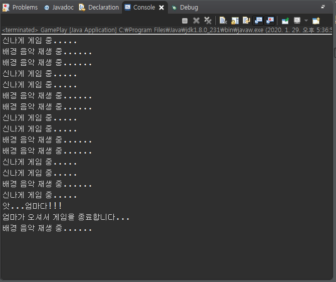 System.out.println("엄마가 오셔서 게임을 종료합니다...");